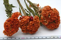 長さ20cm前後です。この品種の特徴として、オレンジ色に若干赤みが入る物があります。またケイトウの特徴として、擦れにより茶色や黒っぽくなった部分が入ることがあります。